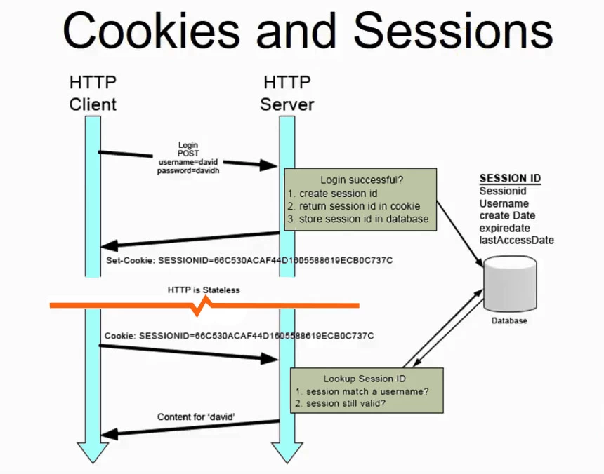 3. 서버는 요청에서 세션아이디를 꺼내 데이터베이스에 저장된 세션아이디와 내용이 같은지, 기간은 유효한지, 어떤사용자인지 식별을 한뒤 인가된 사용자이면 요청받은 데이터를 담아 응답을 한다.