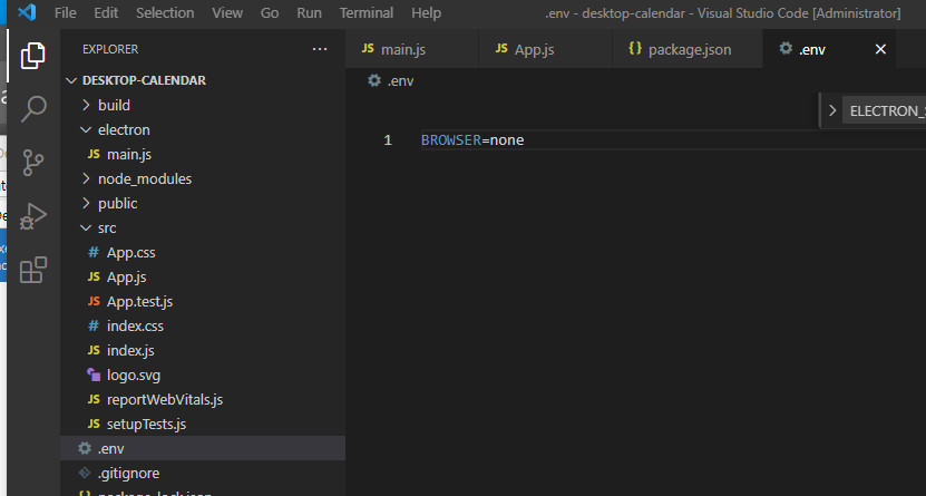 scripts 부분도 수정을 해야한다. scripts 오브젝트내에 electron-start 속성을 입력하고 "set ELECTRON_START URL=http://localhost:3000 && electron ." 을 입력해준다.