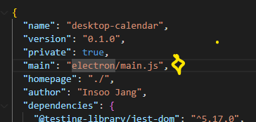 5. 다음은 packages.json을 설정해준다. 먼저 electron이 참조할 main의 위치를 넣어준다. 나는 root에 electron 폴더를 생성하고 main.js 를 넣었기 때문에 그림과 같이 입력했고, 만약에 root에 바로 main.js 를 만들었다면 main.js만 입력해도된다. 그리고 homepage 는 ./ 로 명시한다.