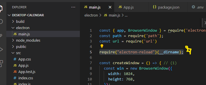 3. root 폴더에 main.js 를 생성하면되는데, 나같은 경우는 electron 폴더를 생성하고 그 밑에 main.js 를 생성했다.
