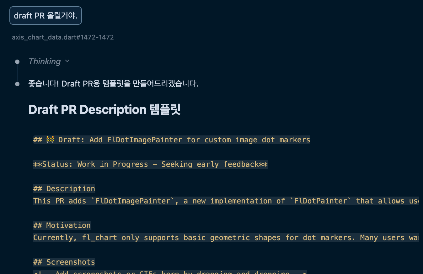 그리고 AI 의 발전을 크게 느꼈는데 이슈 등록과 PR 등록, 주석달기에 큰 도움이 되었다.