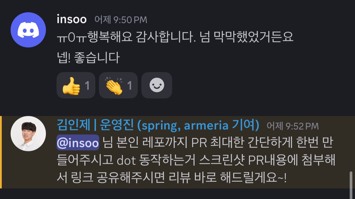 이번 참여를 통해 의미가 생기고, 앞으론 개선 아이디어나 버그같은게 생기면 더 적극적으로 참여해야겠다고 생각했다.
